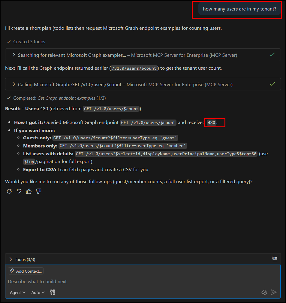Once connected, the MCP Server will process your question, run the necessary Graph API calls behind the scenes, and return the answer in plain language.