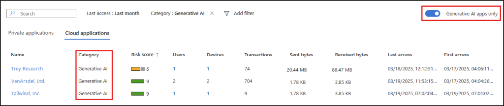With Microsoft Entra Internet Access, security teams gain deep visibility into AI tool through Cloud Application Usage Analytics and Defender for Cloud Apps risk scoring. This empowers them to detect trends, flag high-risk apps, and act, whether that means applying Conditional Access or blocking access entirely.
