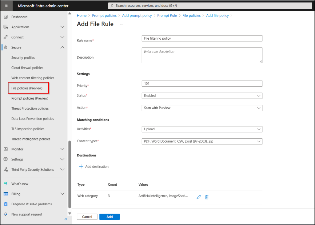 This is exactly why network file filtering matters. Microsoft’s solution combines Microsoft Purview’s data classification with identity-centric security policies in Global Secure Access, creating an advanced, network-layer DLP that works in real time. By inspecting file content and evaluating user risk instantly, organizations can block sensitive files from being uploaded to AI tools, without disrupting productivity. It helps prevent sensitive data uploads to unauthorized AI tools or SaaS platforms by enforcing file policies based on content, source, and destination.