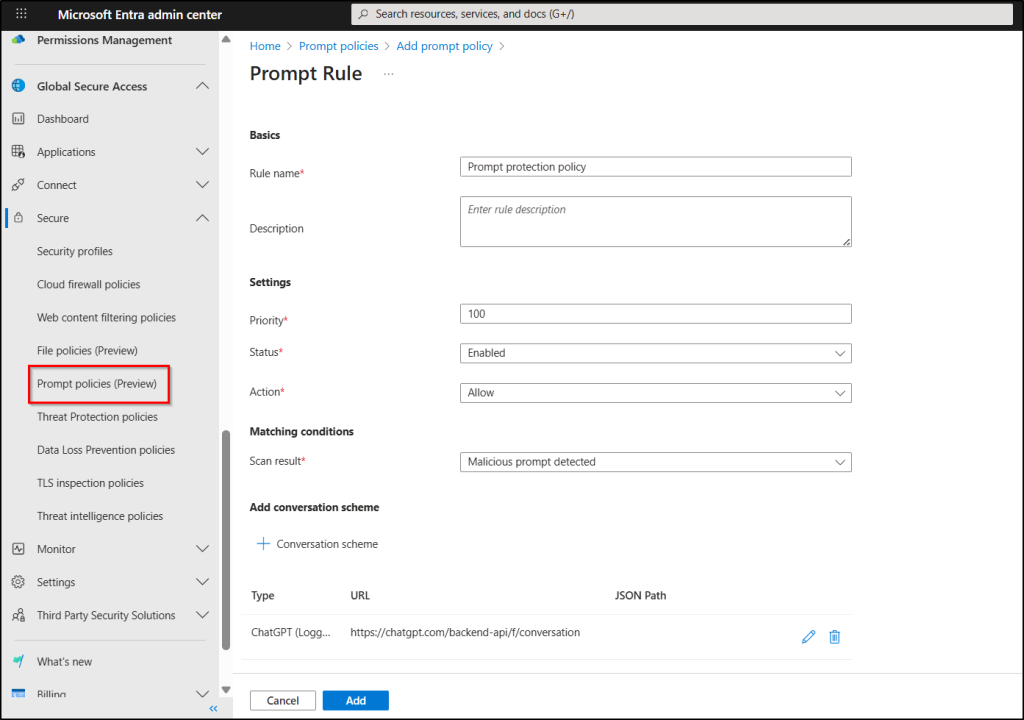 That’s where Prompt shield comes in. This capability provides real-time protection against malicious prompt injections, one of the top risks for Large Language Models (LLMs). By extending Azure AI Prompt Shields to the network layer, Microsoft Entra Internet Access enforces guardrails consistently across all AI apps, agents, and LLMs without requiring code changes or per-app updates.